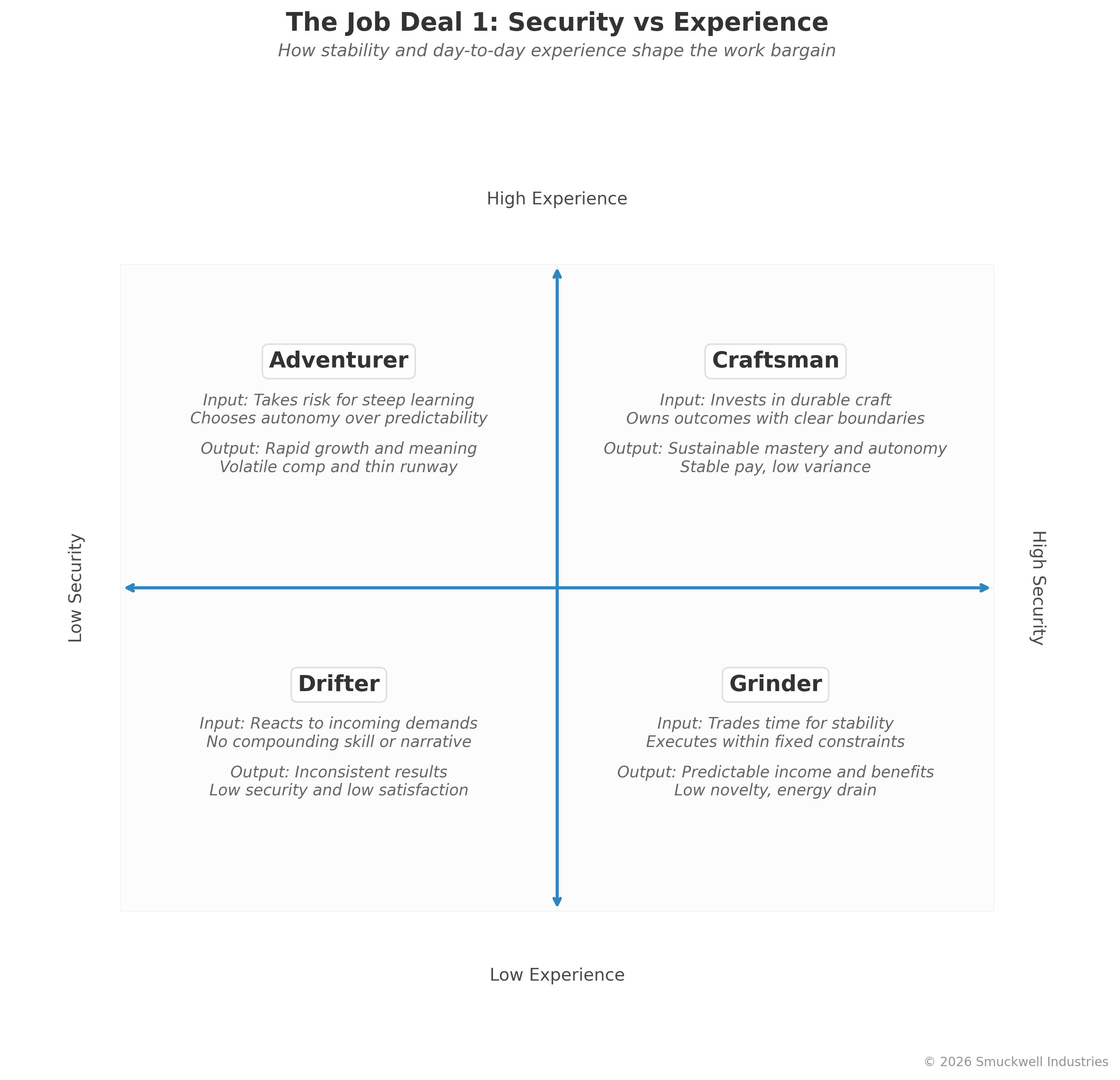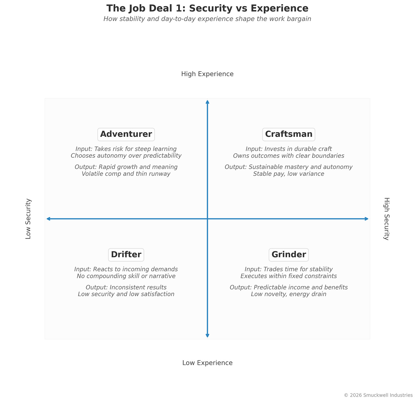 Grinder (low experience, high security): predictable life funding, but the work itself is a slog.