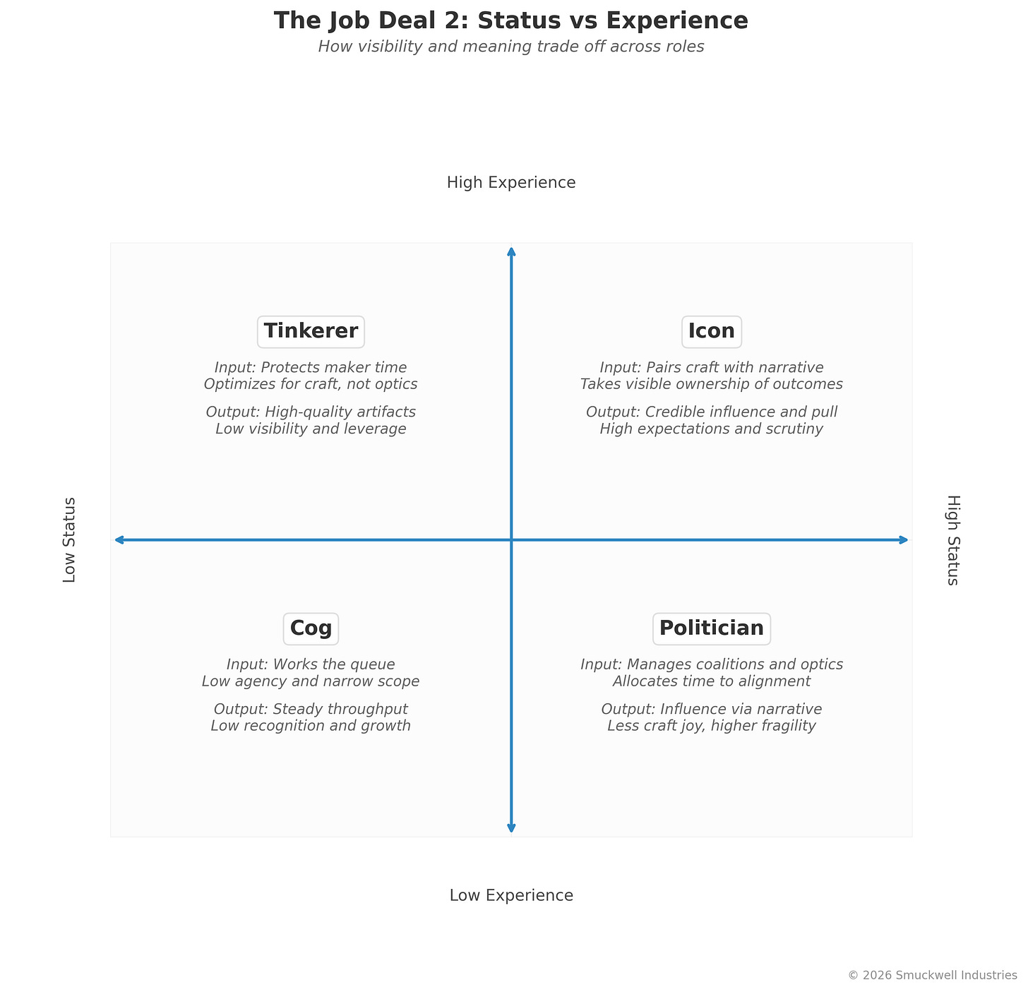 Tinkerer (high experience, low status): deep craft, low visibility, low leverage.
