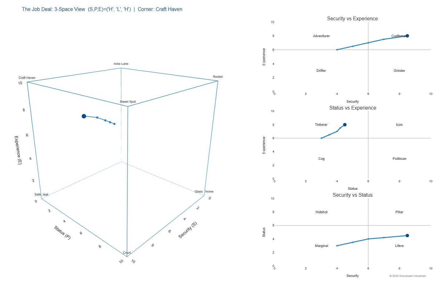 Craftsman (high experience, high security): sustainable mastery with stable footing.
