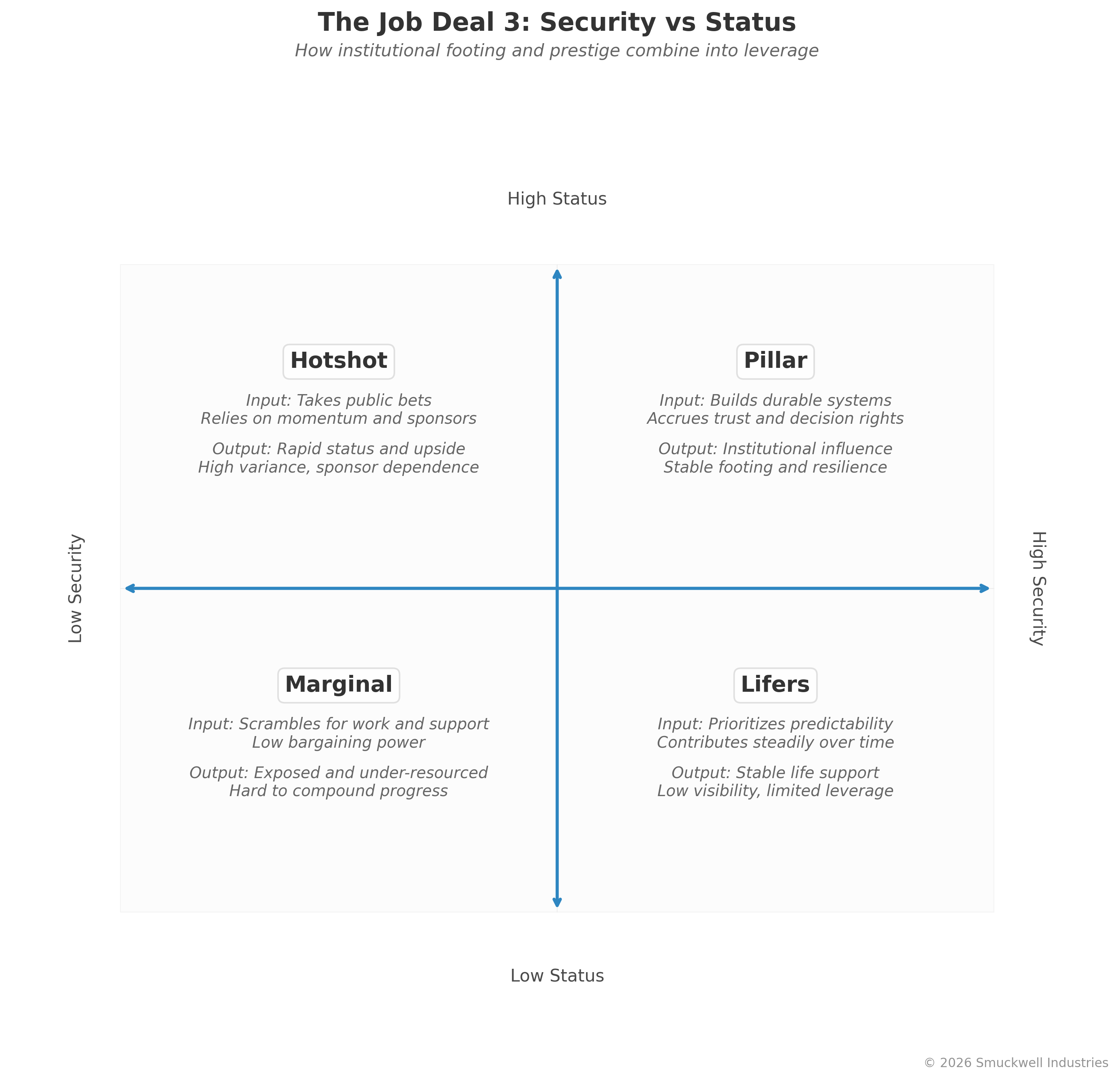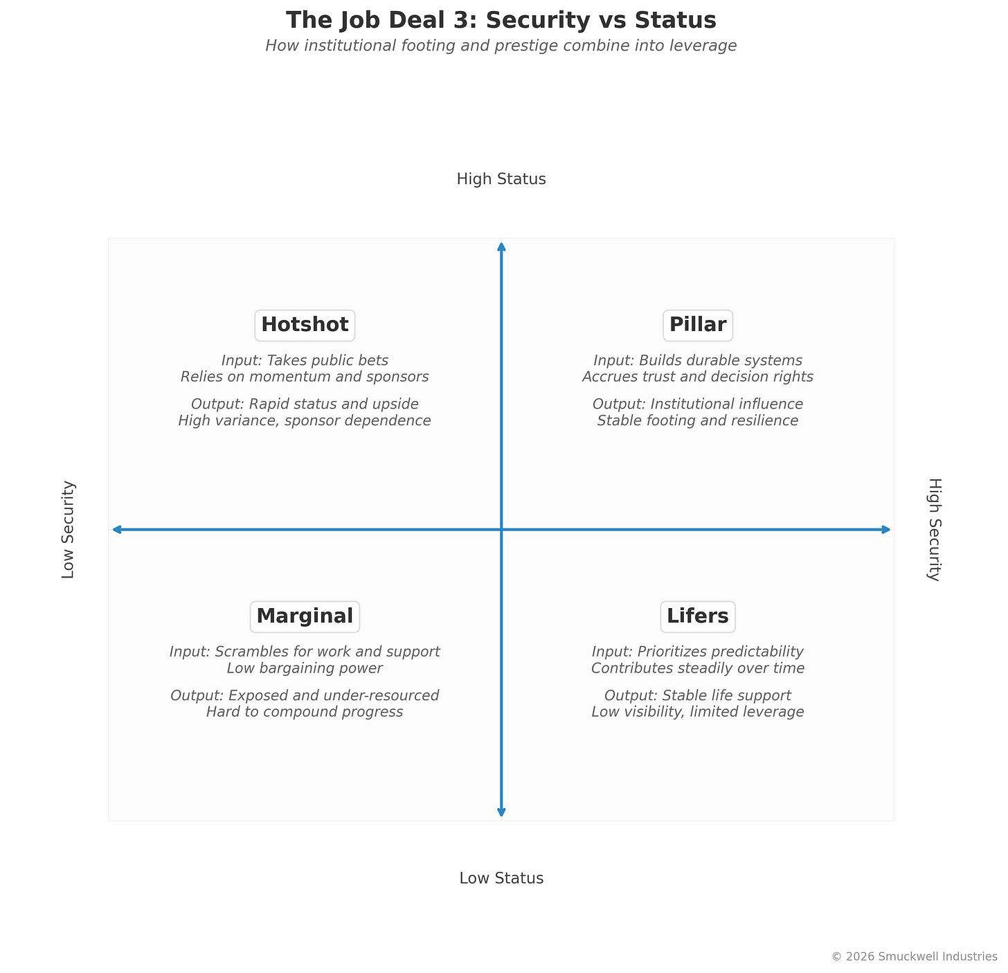 Hotshot (high status, low security): big upside, sponsor dependence, fragile footing.